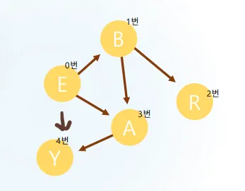 E(0) 처리 → B(1), A(3), Y(4) 발견하여 큐에 추가 및 방문 처리