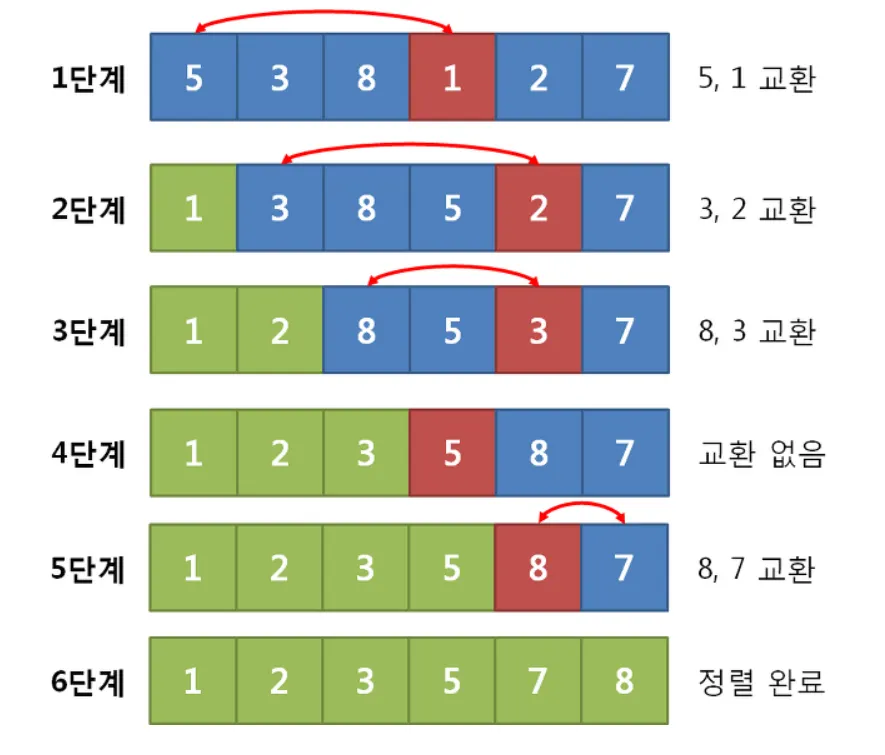 예시 배열: [5, 3, 8, 1, 2, 7]