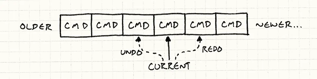 유저가 실행 취소를 선택하면 현재 명령을 실행취소하고 현재 명령을 가리큰 포인터를 한칸 뒤로 이동하다. 몇번 실행 취소 한 뒤에 새로운 명령을 실행하면 , 현재 명령 뒤에 새로운 명령어를 추가 하고 그 다음에 붙어 있는 명령들은 지워준다.