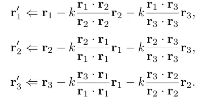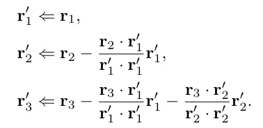 세 번째 벡터 r3에서는 첫 번째와 두 번째 벡터에 평행한 성분을 빼줍니다. 이렇게 하면 r3도 두 벡터와 수직이 됩니다.