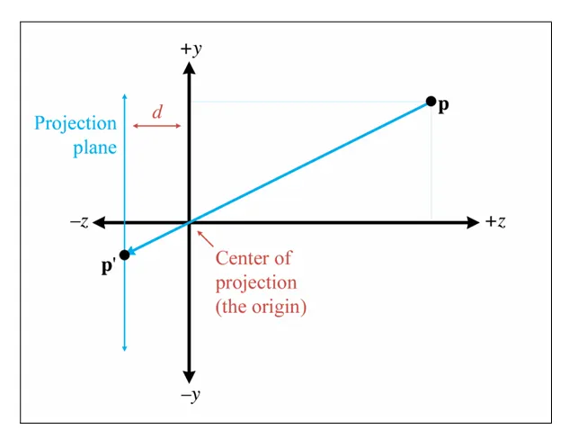 수학적으로는 투영 평면을 z=−dz = -dz=−d로 두는 것이 맞지만, 실제 컴퓨터 그래픽 계산에서는 부호를 단순화하기 위해 투영 평면을 z=dz = dz=d로 옮깁니다. 이렇게 하면 다음과 같이 간단한 형태로 나타낼 수 있습니다:
