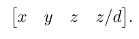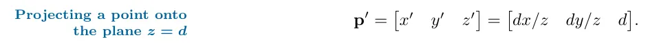 임의의 3D 점 p=(x,y,z)를 투영 평면으로 이동시켜 새로운 좌표 p′=(x′,y′,z′)을 계산할 수 있습니다. 유사 삼각형을 사용하여 다음과 같은 관계를 얻습니다: