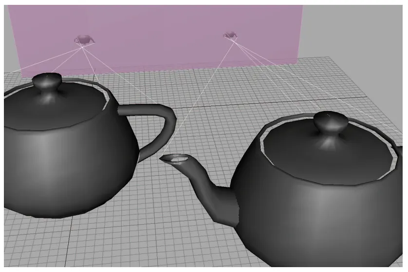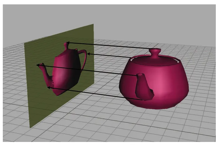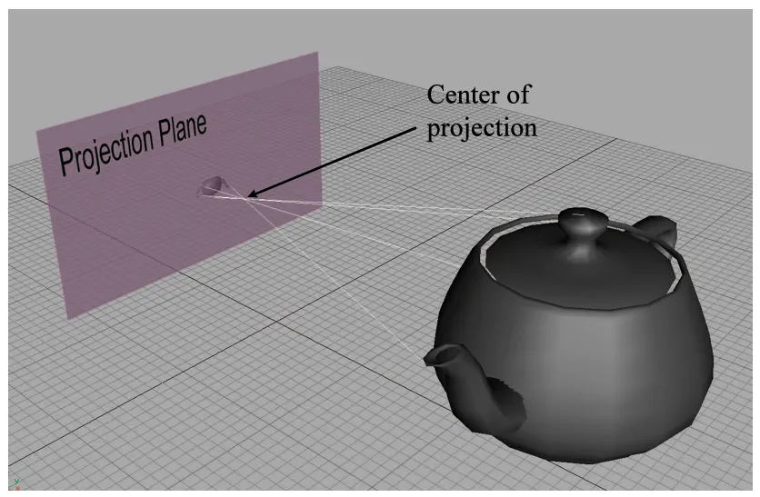 원근 투영(perspective projection): 3D 객체를 2D 평면에 투영할 때, 모든 투영선이 특정 지점(투영의 중심점)에서 교차합니다. 이 중심점은 보통 관찰자의 위치를 나타내며, 거리에 따라 객체가 더 작아지게 보이는 원근 축소 효과를 만듭니다.