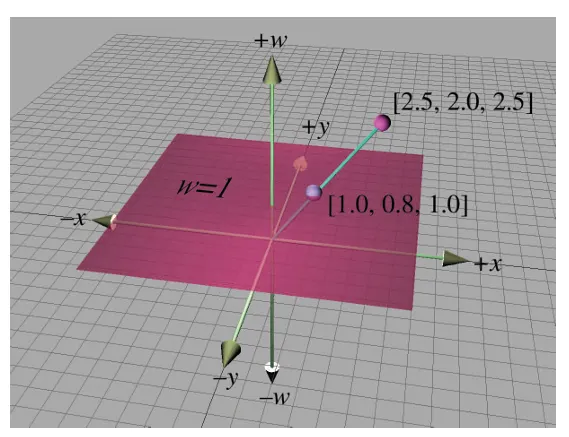 3D 좌표를 4D로 확장하기 위해 (x,y,z) 좌표에 w라는 네 번째 요소를 추가하여 **동차 좌표(homogeneous coordinate)**를 만듭니다. 예를 들어, 3D 점 (x,y,z)는 4D 공간에서는 동차 좌표 (x,y,z,1)로 표현됩니다. 여기서 w를 1로 설정하면 3D 공간에서의 변환을 쉽게 4D 공간에서 표현할 수 있습니다.