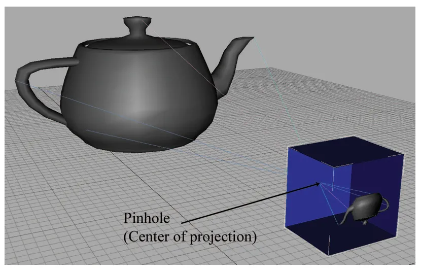 빛은 핀홀을 통해 들어가면서 한 점에서 수렴하며, 그 결과로 상자 안쪽에 투영된 이미지는 상하 반전되어 나타납니다. 이는 모든 광선(투영선)이 핀홀에서 교차하기 때문입니다. 이 핀홀을 투영의 중심(center of projection)이라 합니다.
