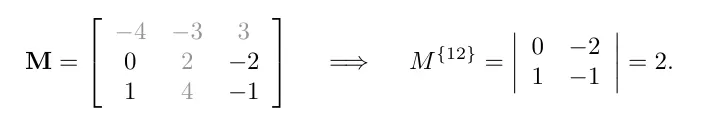 아래 행렬에서 1행과 2열을 삭제한 행렬 M{12}를 만들었습니다.