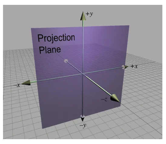 3D 좌표 공간에서 투영 평면은 보통 다음과 같은 방식으로 설정됩니다: