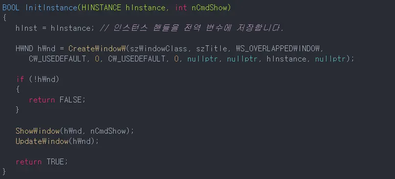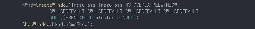 핸들을 리턴값으로 넘겨준다. 넘겨지는 윈도우 핸들은 hWnd라는 지역 변수에 저장되었다가 윈도우를 참조하는 모든 함수의 인수로 사용된다.