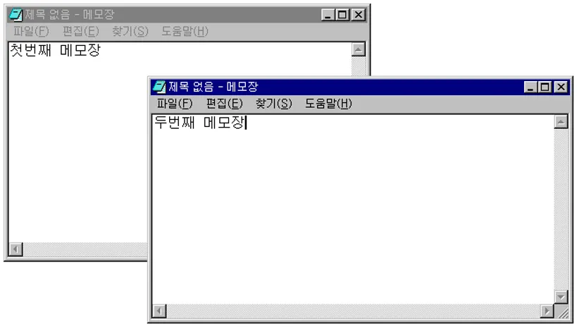 예를 들어 메모장이 다음과 같이 두번 실행 되어 있다고 해 보자.