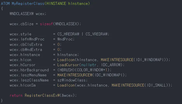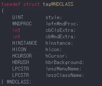 윈도우 클래스의 이름을 정의하는 lpszClassName과 메시지 처리 함수를 지정하는 lpfnWndProc이다. 윈도우 클래스를 정의한 후