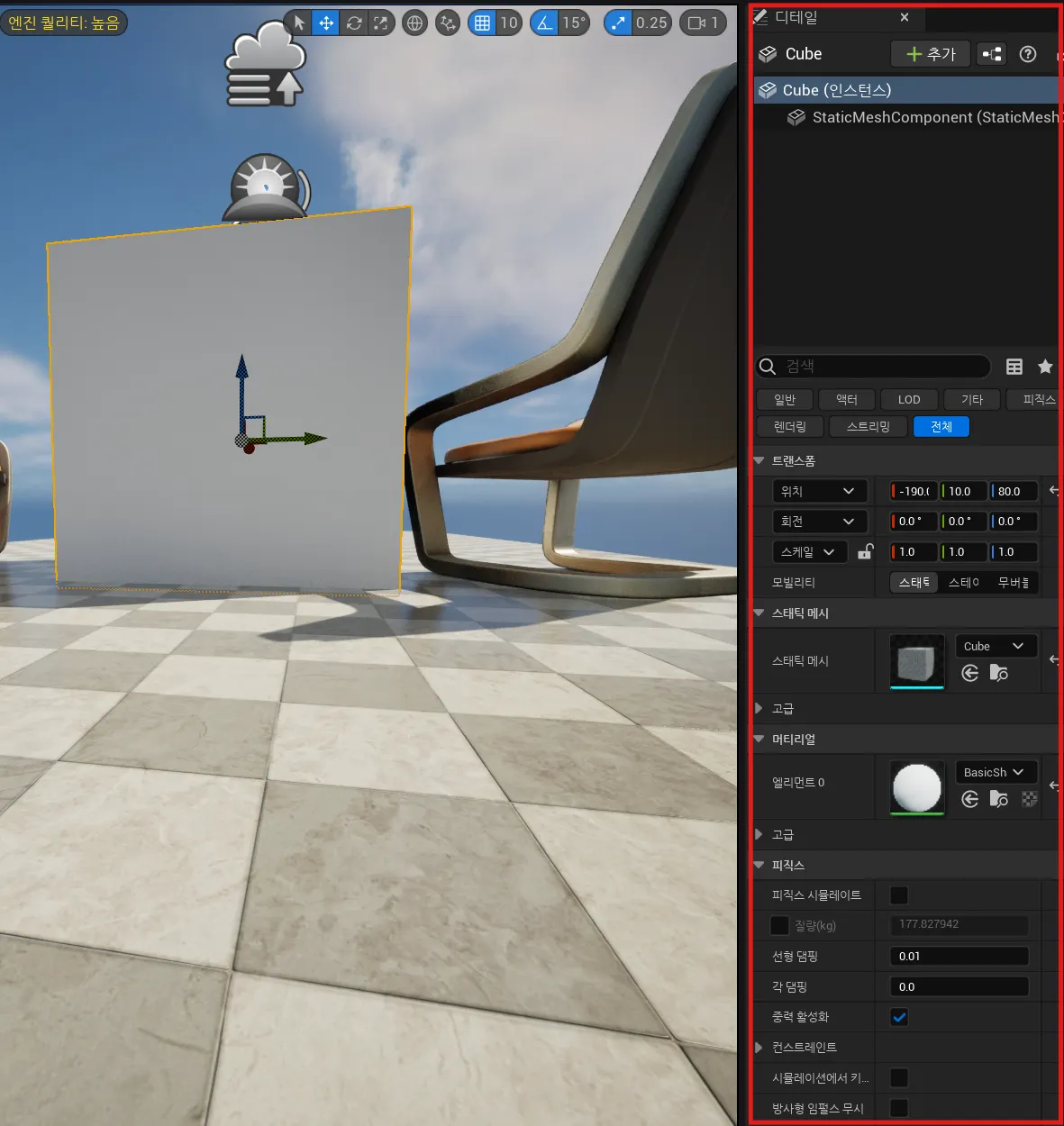 엑터를 선택하게 되면 오른쪽에 있는 디테일 패널에 오브젝트에 관한 정보들이 표시됩니다. 우리가 기즈모를 통해서 마우스로 물체를 이동시킬수 있었찌만 디테일 패널에 있는 값을 편집해서 숫자로 조작도 가능합니다.