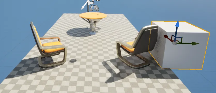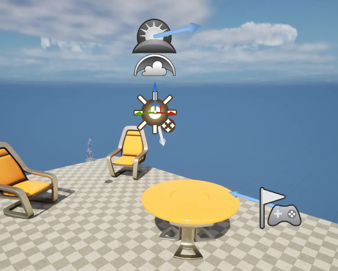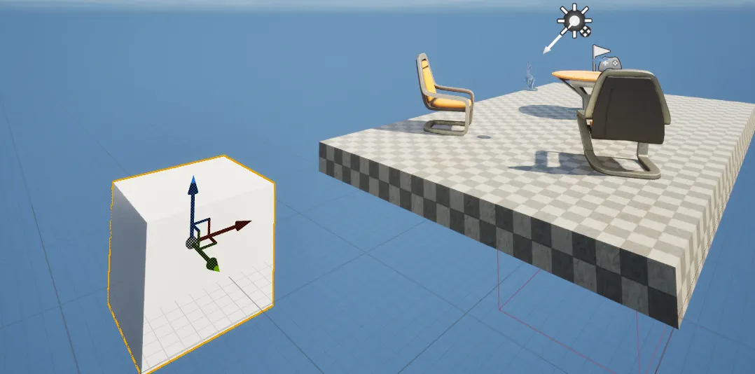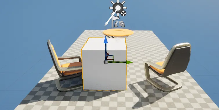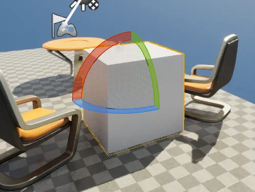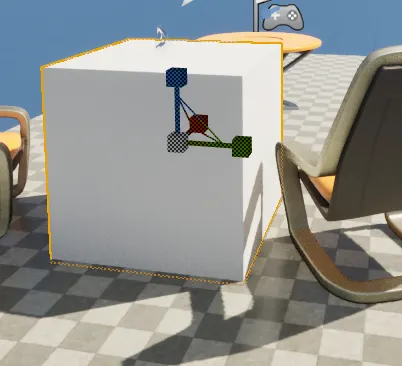 클릭하게 되면 오브젝트에 파랑색,빨강색,초록색 방향을 가르키는 화살표가 표시됩니다. 이를 기즈모라고 합니다. (guizmo) 기즈모란 화면상에서 엑터를 이동시키기 위해 도와주는 UI라고 생각하시면 됩니다. 이동 기즈모를 통해서 원하는 위치로 이동시켜 봅시다.