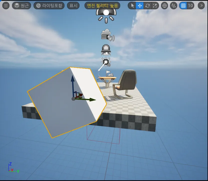 이제 엑터를 다양하게 이동시켜보고 회전시켜보고 크기를 늘려보고 다뤄봅시다. 오브젝트를 선택하는 방법은 매우 간단합니다. 마우스로 해당 오브젝트를 클릭하면 됩니다.