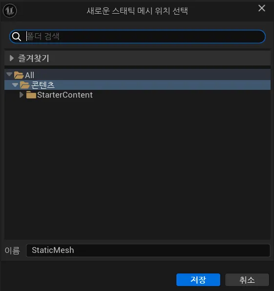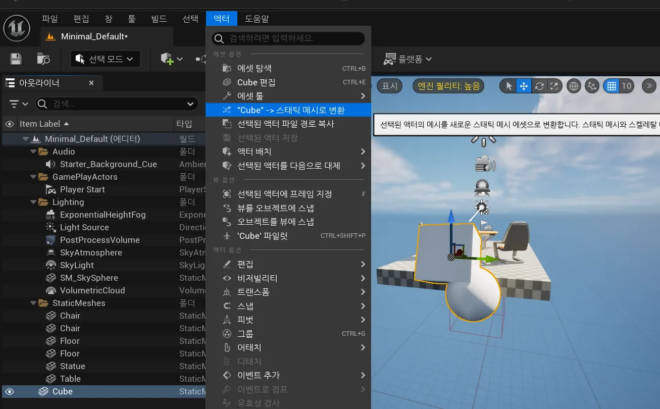 내가 만든 큐브를 언리얼의 스태택메시 에셋으로 정할수 있다. 추후에 자주 사용된다면 저장해두고 불러와서 언제든지 필요할때마다 레벨에 배치하여 사용할 수 있습니다.