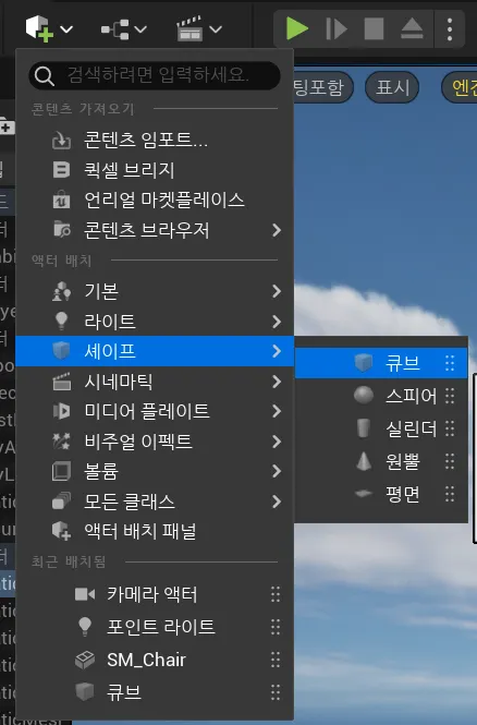 툴바의 추가 아이콘을 이용하여 엑터를 추가해보세요. 그러면 CUBE 엑터가 생성됩니다.