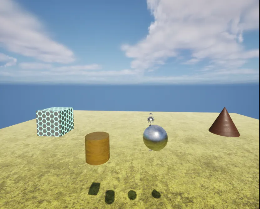 지금까지 배운것들을 통해서 새로운 레벨에 평면을 배치하고 알맞은 Material을 설정하여 땅을 만들어 봅시다. 그리고 다양한 도형들을 배치 해 봅시다.