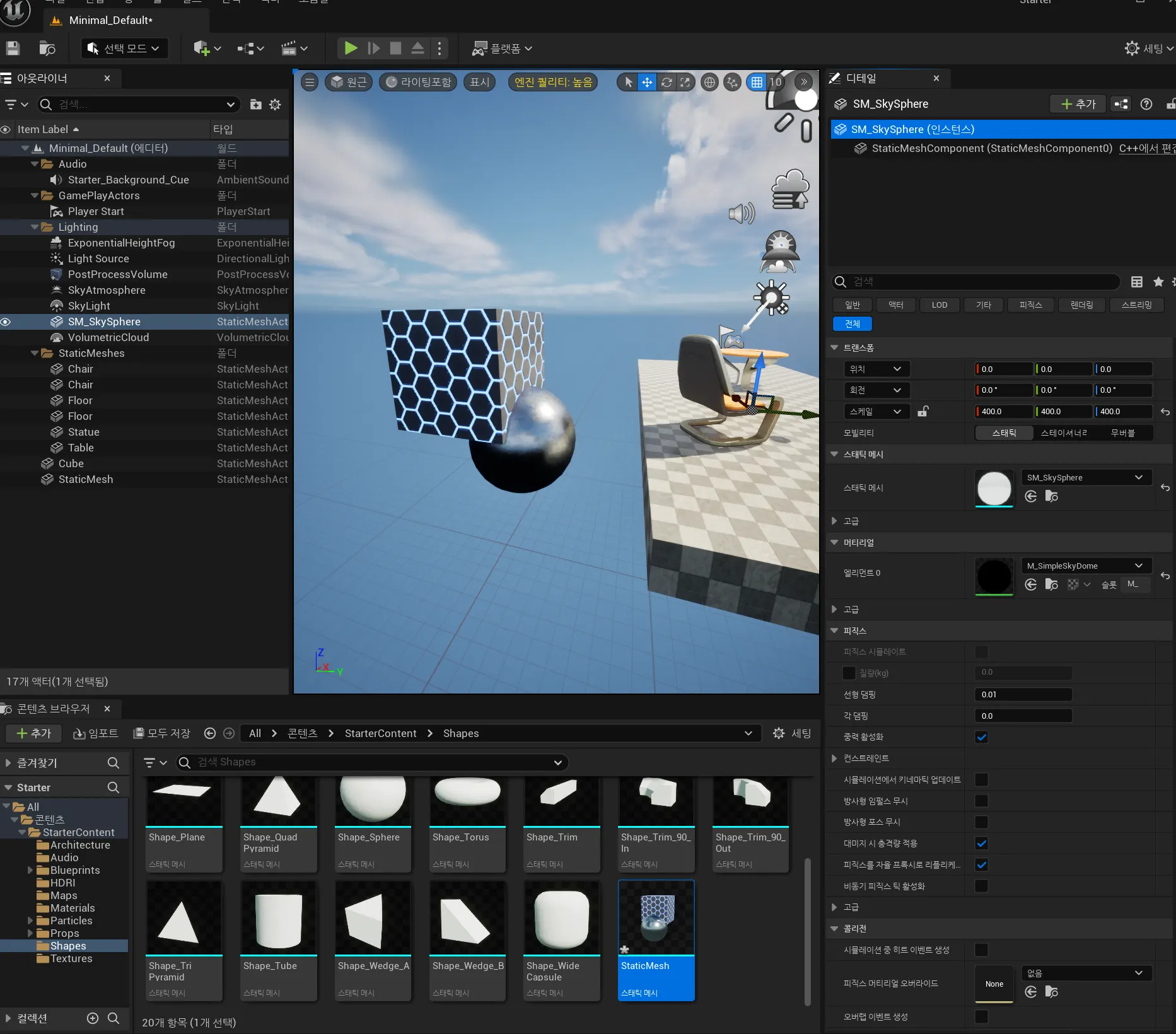 그리고 콘텐츠 브라우저에서 해당 스태틱메쉬를 드래그앤 드롭하여 레벨에 배치해봅시다.