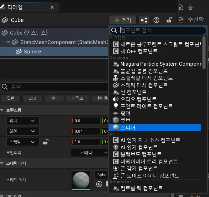 두번째 도형을 추가 해봅시다. 디테일 패널에서 +추가 버튼을 클릭한후 원하는 도형을 추가하면 됩니다. 기존의 Cube에 도형을 추가 했기 때문에 안에 겹쳐서 안보일것입니다. sphere를 선택하여 위치를 조정하여 잘 보이게끔 옮겨 봅시다.