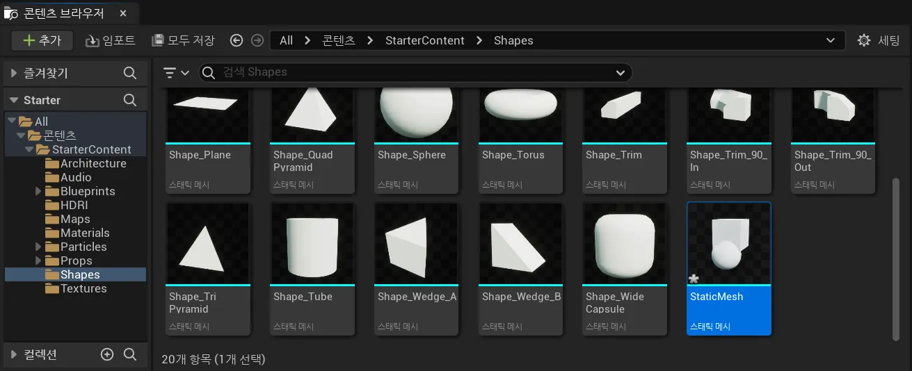 입체적인 도형의 형태를 나타내는 데이터를 메쉬(폴리곤)이라고 합니다. 그중에서도 움직이지 않는 메쉬를 스태틱메쉬(static mesh)라고 합니다. 스태틱 메시를 사용해 입체 도형을 나타내는 엑터를 스태틱 메시 엑터라고 합니다. 편의상 shape actor라고 부르겠습니다.
