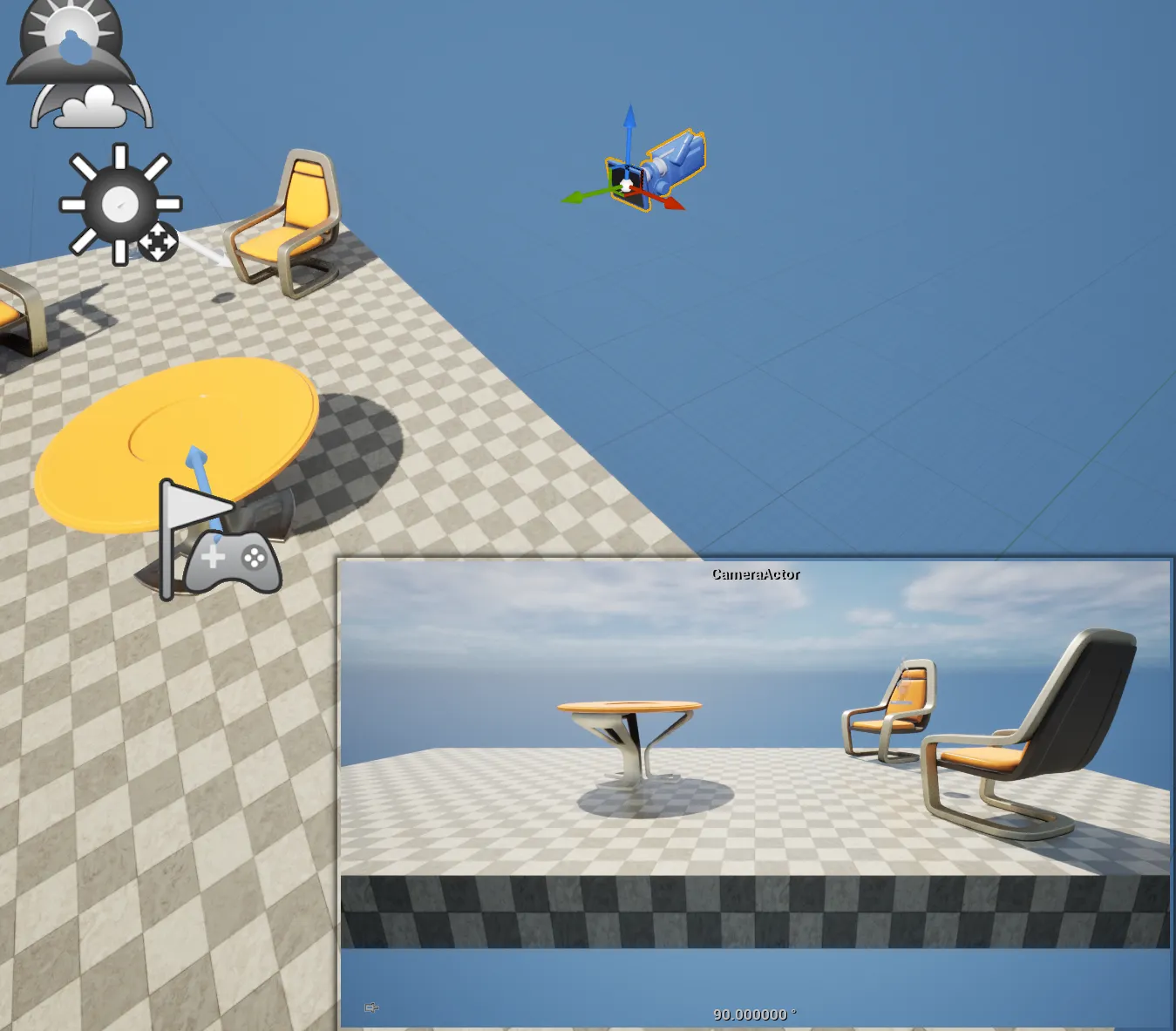 뷰포트 표시는 카메라의 시점 기준으로 그려집니다. 특별한 경우에는 레벨안에 카메라를 여러개를 사용 할 수도 있습니다. 간단한 씬을 구성한다면 하나면 충분합니다.