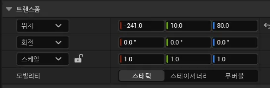 엑터의 위치, 회전, 스케일 정보를 바꿀수 있습니다. 숫자 부분을 클릭해 직접 값을 변경할수도 있습니다. 다양한 방법을 통해서 값을 변경해보세요.