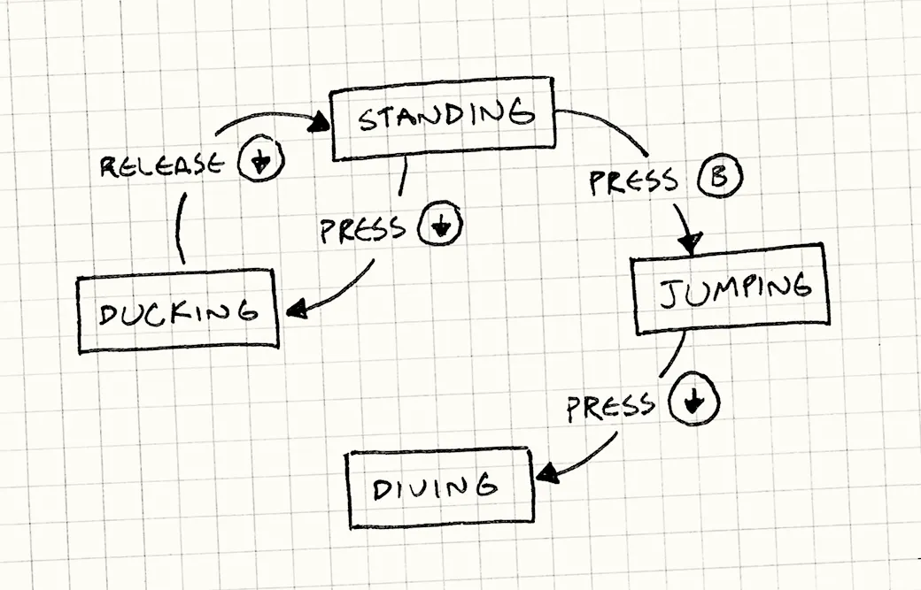 한번에 한가지 상태만 활성화 될 수 있다. 주인공은 점프와 동시에 스탠딩을 할 수 없다. 한가지가 완벽하게 끝나거나 특정조건에만 다른상태로 바꿀수 있도록 만들어야한다. 핵심은 두가지상태가 존재할수 없다.