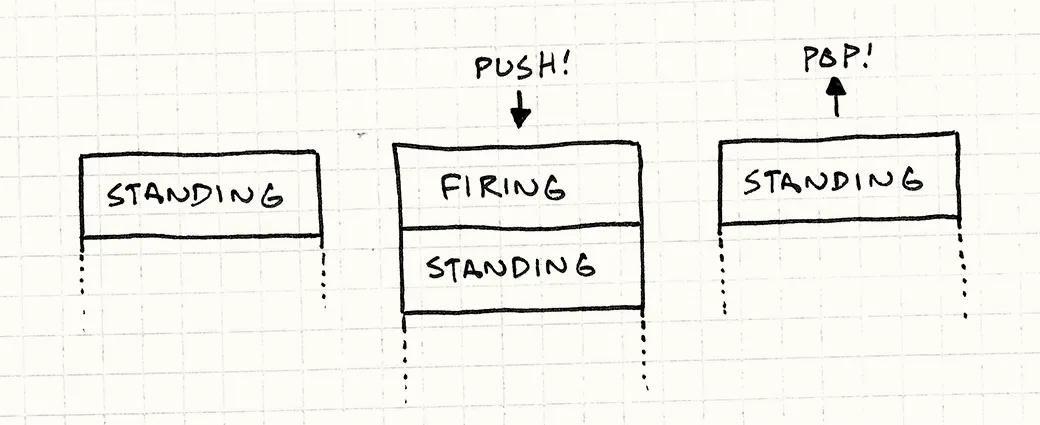 일반적인 FSM은 이렇게 이전상태를 알수없다. 이것보다 총쏘기 전 상태를 저장해두었다가 나중에 불러와서 써먹으면 된다. 이럴때 써먹을 만한 것이 푸시다운 오토마타이다.