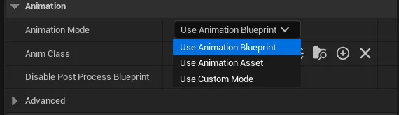 언리얼 엔진에서 캐릭터에 애니메이션을 적용할 때 고려할 요소는 애니메이션 모드입니다. 캐릭터의 스켈레탈 메시에는 두 가지 방식이 있습니다: