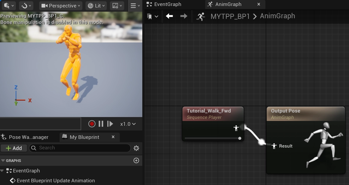 애님 그래프(Anim Graph): 애니메이션이 실제로 어떻게 재생될지 정의합니다. 구처젝언 애니메이션 처리를 작성하는 그래프입니다. 이 그래프에는 기본으로 최종 애니메이션 포즈라는 노드가 배치되어 있습니다. 머테리얼의 결과 노드와 비슷합니다. 결과 노드와 마찬가지로 다양한 처리 결과로 결정된 애니메이션을 이 노드에 연결해서 애니메이션 재생되게 합니다.