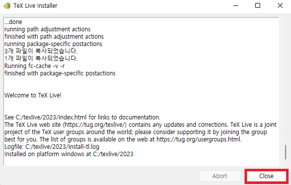 TeX Live가 무사히 설치되었다면 다음과 같은 화면을 확인할 수 있습니다. 'Close'를 클릭하여 설치를 완료하세요.