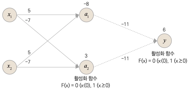 모든 단계에서 활성화 함수는 0 이상이면 1을 출력하고, 0보다 작다면 0을 출력하는 이진분류 함수를 이용하겠습니다.