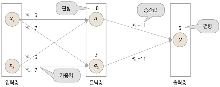 Note: 출력층은 출력값을 내보내는 층이기 때문에 구조적으로는 은닉층과 동일합니다. 그래서 똑같이 가중치와 편향이 존재합니다. 활성화 함수는 사용자 임의대로 사용하는 함수라서 이번 예제에서는 굳이 수식이 필요하지 않은 매우 간단한 함수를 이용했습니다.