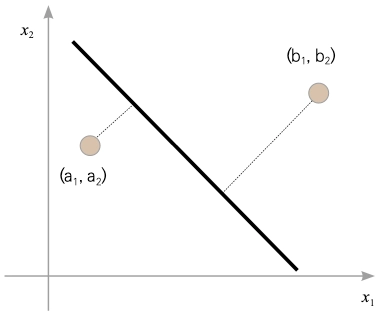 가중치가 변함에 따라 위 그래프에서 직선의 기울기와 위치가 변할 겁니다. 뉴런의 계산 결과인 a의 값에 의해 직선의 아래에 있는지 혹은 위에 있는지 결정을 내릴 수 있기 때문에 위와 같은 직선을 결정 경계라고도 부릅니다. 그럼 결정 경계를 이용해 어떤 문제를 해결할 수 있을까요? 다음과 같은 데이터가 주어져 있다고 합시다.