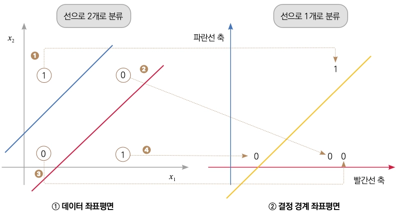 두 좌표평면은 각각 축이 다르게 설정되어 있습니다. ① 데이터 좌표평면은 x1과 x2를 표현하는 축인 것에 반해, ② 결정 경계 좌표평면은 가로축이 빨간선의 결괏값, 세로축은 파란선의 결괏값을 나타내고 있습니다. ①번 좌표평면에 있는 점을 ②번 좌표평면으로 옮길 수 있다면 선 하나로도 1과 0을 구분지을 수 있습니다(1장에서 선은 ‘데이터를 표현하는 직선인 가설’이라고 말씀드렸습니다. 즉 다층 신경망도 마지막에 데이터를 분류하려면 선(가설)이 하나이어야 합니다). 왼쪽 좌표평면상의 점을 어떻게 오른쪽 좌표평면으로 이동시킬 수 있을까요?