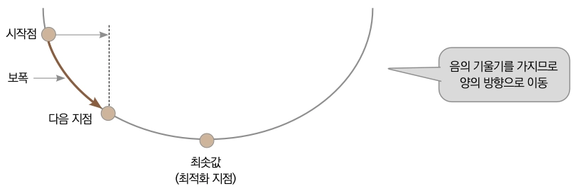 경사 하강법에서는 시작점으로부터 어느 정도 이동할지를 손실 함수의 기울기와 학습률(Learning Rate)로 결정합니다. 시작점의 기울기를 알아내려면 손실 함수를 미분해야 합니다. 기울기가 음의 기울기라면 가중치가 양의 방향으로 이동해야 한다는 뜻이고, 기울기가 양의 기울기라면 가중치가 음의 방향으로 이동해야 한다는 뜻입니다.