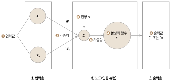 퍼셉트론은 ① 입력층, ② 노드(인공 뉴런), ③ 출력층으로 구성됩니다. 뇌세포는 다른 뇌세포로부터 일정 강도 이상(임곗값)의 자극(입력)을 받지 않으면 다음 뇌세포로 정보를 전달하지 않습니다. 인공 신경망 역시 입력값에 가중치를 곱해 더해준 다음, 활성화 함수를 이용해 다음 노드에 정보를 전달할지 말지를 결정합니다. 가중치는 중요한 입력값을 더 키우고, 중요하지 않은 입력값을 줄이는 등, 입력에 대한 중요도를 나타내는 숫자입니다. 그림에서 보면 ❶ 입력값( x1, x2)에 대응하는 ❷ 가중치(w1, w2)가 각각 곱해진 다음, ❹ 활성화 함수(F)의 입력으로 사용되었습니다. 이때 더해지는 ❸ 편향은 활성화 함수의 임곗값을 이동시키는 역할을 합니다. 활성화를 거친 후 얻어지는 값을 ❺ 출력값이라고 부릅니다. ❻ 또한 입력값과 가중치를 곱해서 얻은 가중합이 활성화 함수의 입력으로 사용됩니다.