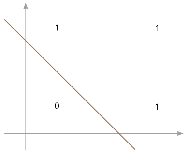 앞의 그림과 같은 데이터가 주어졌을 때 직선을 이용하면 0과 1을 구분할 수 있습니다. 적당한 가중치가 주어진다면 그림과 같은 결정 경계를 만들 수 있고, 입력에 따라 결정 경계의 값보다 크다면 1로, 작다면 0으로 구분할 수 있습니다. 또한 이 결정 경계를 만들기 위해 하나의 퍼셉트론을 이용했으므로 이런 구조를 단층 신경망이라고 부릅니다.