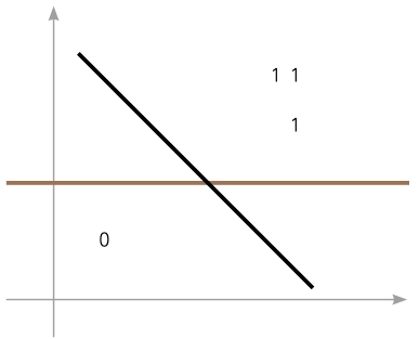 먼저 두 직선(파란선과 빨간선)을 그어줍니다. 이 두 선은 각각이 결정 경계가 되어 선보다 위에 있는 값은 1을, 작은 값은 0을 반환한다고 가정합시다. ❹ 의 1이 빨간선 아래에 있다고 헷갈리지 마세요. 아직은 계산의 중간 단계에 있기 때문에 정답값은 고려하지 않아도 됩니다. 정답값은 모든 계산이 끝난 신경망의 최종 출력에서만 고려합니다.