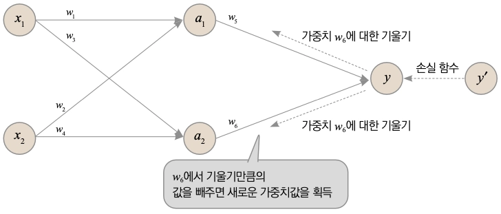 앞에서 살펴본 수식은 하나의 가중치를 업데이트하는 수식이었습니다. 실제로는 수십만 개의 가중치가 있기 때문에 손실 함수를 사용해 일일이 가중치에 대해 미분해서 값을 수정하는 일은 어렵습니다. 그렇다면 어떻게 해야 할까요?