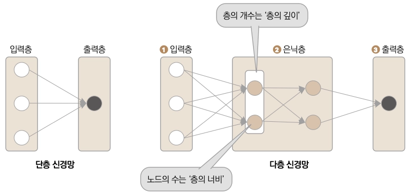 이처럼 직선 하나로 구분이 불가능한 데이터 분포도 직선을 여러 개 이용하면 구분할 수 있습니다. 직선 하나를 사용하면 단층 퍼셉트론single layer perceptron, 여러 층에 걸쳐 퍼셉트론이 분포되어 있으면 다층 퍼셉트론(MLPMulti Layer Perceptron)입니다. 비슷하게 하나의 층이 존재하는 신경망을 단층 신경망, 여러 층이 존재하는 신경망을 다층 신경망이라고 부릅니다. 퍼셉트론보다 신경망이 더 넓은 범위를 이르는 용어이므로 이후에는 구분 없이 ‘신경망’으로 부르겠습니다. 단층 신경망과 다층 신경망을 그림으로 알아보겠습니다.