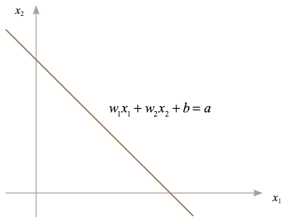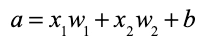 앞의 그림에서 사용한 입력값은 총 2개였습니다. 즉 y값은 x1과 x2로 표현할 수 있다는 뜻입니다. 가중치(w1, w2)는 변하는 값이 아니라 고정된 상수이므로, 뉴런의 가중합(a)을 그림으로 나타내면 다음과 같습니다.
