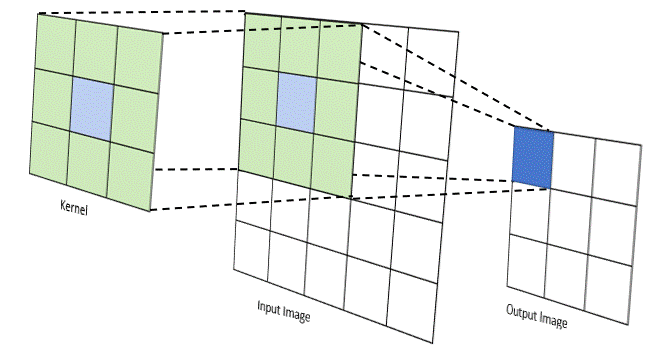 이미지에서 커널과 겹치는 부분의 각 픽셀 값을 커널의 해당 위치 값과 서로 곱합니다. (요소별 곱셈)