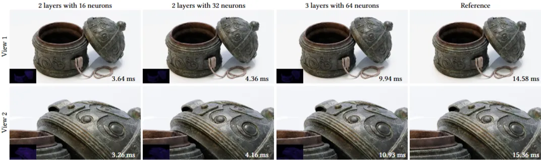 제안된 신경 머티리얼은 단순한 분석적 모델보다 복잡한 다중 레이어 머티리얼의 시각적 복잡성을 훨씬 더 충실하게 재현합니다. 특히 시야각에 따라 변화하는 색상 같은 미묘한 효과를 잘 포착합니다. 가장 큰 신경망 구성(은닉 레이어 3개, 각 64개 뉴런)은 참조 머티리얼을 매우 정확하게 재현합니다.