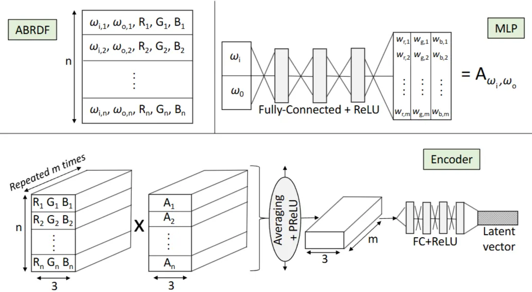 . 여기서 를 인코더, 를 어그리게이터, 를 디코더라고 부릅니다. 어그리게이터 는 입력 관측값의 순서 불변성을 보장하기 위해 평균 함수를 사용합니다. 모든 네트워크는 완전 연결(fully connected, FC) 레이어로 구성되며, 디코더의 마지막 레이어에는 ReLU(rectified linear units)를 적용하여 BRDF 반사율의 음수 값을 방지합니다.