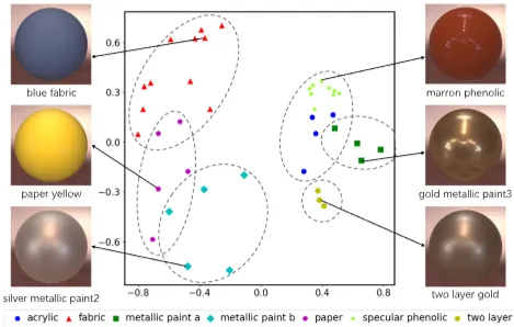 학습된 잠재 공간은 효율적인 BRDF 편집 및 보간을 가능하게 합니다.