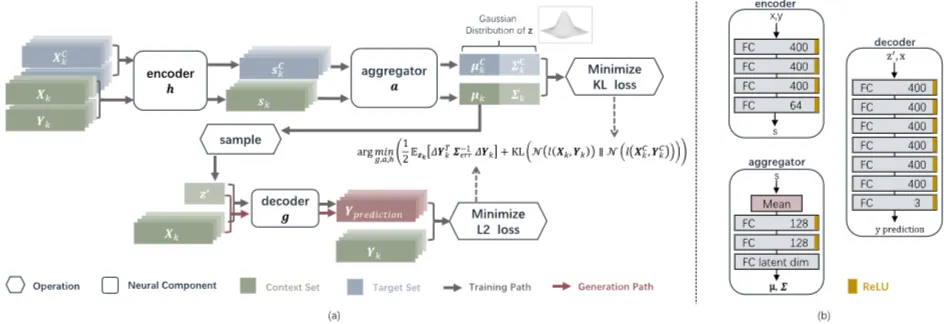 함수 와 은 심층 신경망으로 표현됩니다. 은 두 부분으로 분해됩니다: 개별 관측값을 인코딩하는 비선형 함수 와 인코딩된 관측값 세트를 통합하는 함수 입니다.