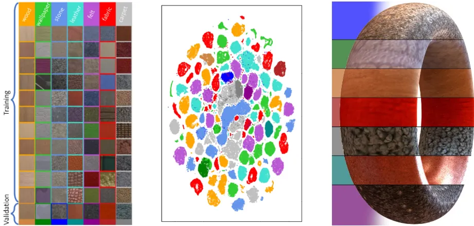 BRDF 보간 및 편집: 두 BRDF의 잠재 벡터를 선형 혼합하여 보간할 수 있습니다. 이는 반사 하이라이트의 모양과 확산 반사 강도를 부드럽게 변화시킵니다. 또한 잠재 공간의 의미론적 구조를 활용하여 "특성 벡터(trait vectors)"를 따라 BRDF를 편집할 수 있습니다. SVM(Support Vector Machine)으로 13가지 지각적 특성(예: 고무, 금속성, 직물 등)에 대한 하이퍼플레인을 구하고, 이 평면의 법선 방향(특성 벡터)을 따라 이동하여 재료 외관의 변화를 관찰합니다.