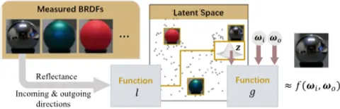 여기서 이며, 은 Kullback-Leibler 발산입니다. 훈련은 MERL 및 EPFL 데이터셋의 BRDF를 사용하여 Adam 옵티마이저로 수행됩니다.