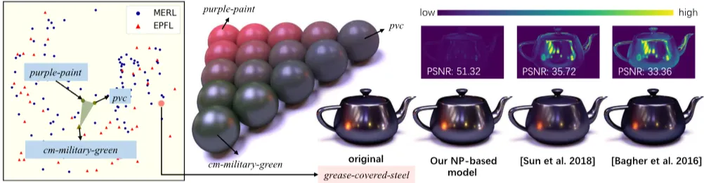 본 연구는 NPs를 활용하여 측정된 BRDF를 위한 새롭고 압축적인 표현을 제시합니다. BRDF를 이산적 행렬이 아닌 연속 함수로 처리함으로써, 신경망으로 복잡한 비선형 관계를 학습하여 전례 없는 압축성과 정확도를 달성했습니다. 본 방법은 자세한 통계와 최신 방법과의 비교를 통해 효율성을 입증했으며, BRDF 압축 및 편집이라는 두 가지 응용을 통해 실용성을 보여주었습니다. 후처리 학습된 하이퍼네트워크를 사용하면 소수의 BRDF도 효율적으로 압축할 수 있으며, 중요 샘플링 신경망과 통합된 대화형 편집 도구는 BRDF 탐색과 조작을 용이하게 합니다.