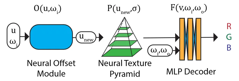 본 논문은 다양한 스케일에서 복잡한 재료의 외관을 표현하고 렌더링하기 위한 새로운 신경망 기반 기법인 NeuMIP(Multi-Resolution Neural Materials)를 제안합니다. 기존의 전처리(prefiltering) 기법인 밉매핑(mipmapping)은 확산 색상(diffuse color) 같은 단순한 재료 특성에는 효과적이지만, 노멀(normals), 자기 그림자(self-shadowing), 섬유(fibers) 또는 더 복잡한 미세 구조 및 반사(reflectances)에는 일반화되지 못합니다. NeuMIP는 이 문제를 해결하기 위해 전통적인 밉맵 피라미드를 '신경망 텍스처 피라미드(neural texture pyramid)'로 일반화하고, 이를 완전 연결 신경망(fully connected network)과 결합합니다. 또한 '신경망 오프셋(neural offsets)'이라는 새로운 기법을 도입하여 복잡한 시차 효과(parallax effects)를 가진 재료를 테셀레이션(tessellation) 없이 렌더링할 수 있게 합니다. 이 신경망 오프셋은 명시적인 높이 필드(heightfield)의 지도 없이(unsupervised) 훈련됩니다.